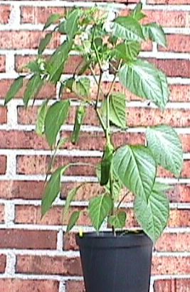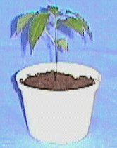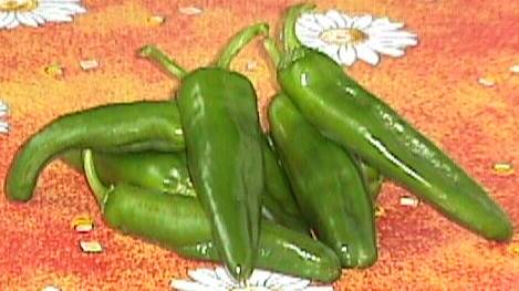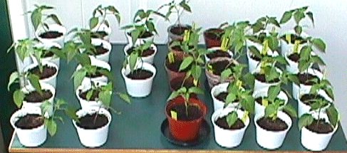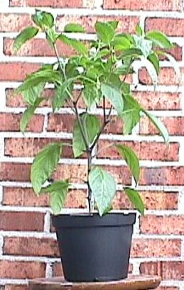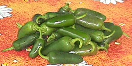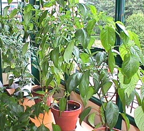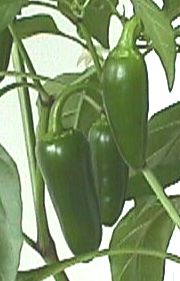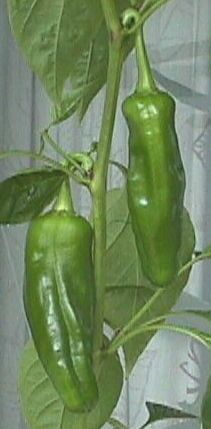 Till vänster blommande Jalapeño. Till höger Anaheim med två frukter. |